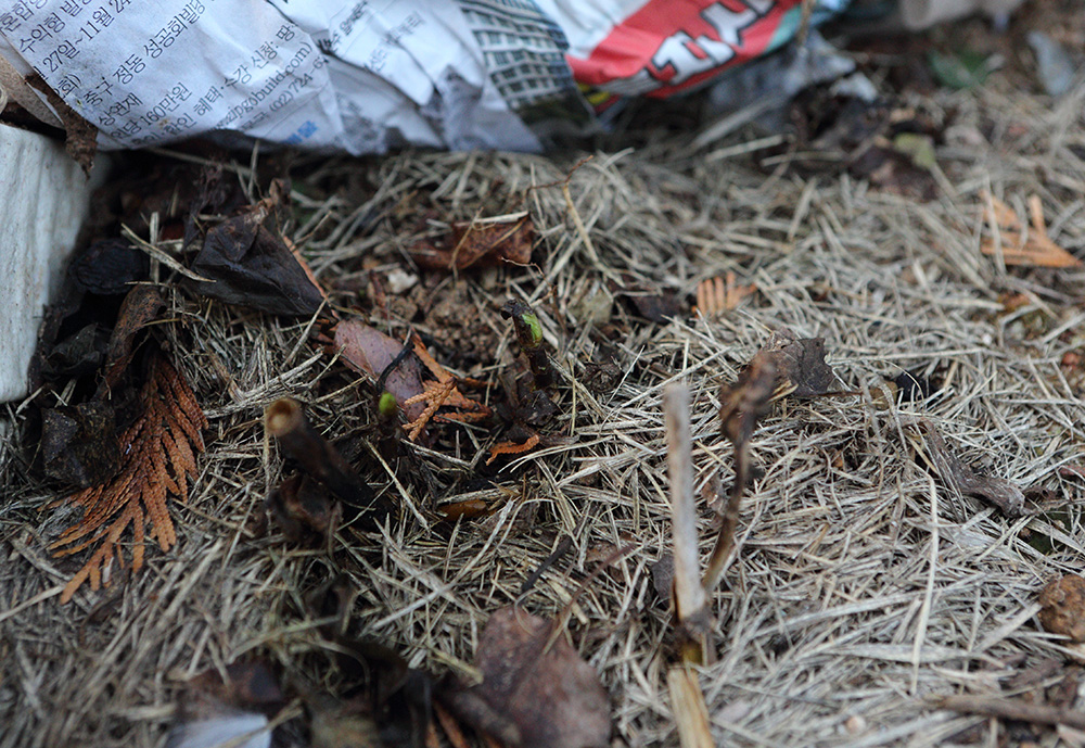 뿌리가 내린 가을에 마당에 옮겨 심고 신문과 수목보온재로