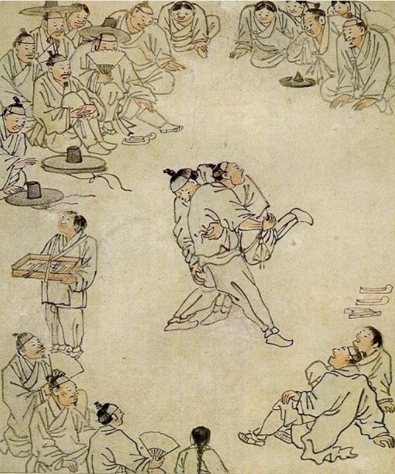 화가 김홍도는 지금 이 씨름그림을 보고 있는 우리들에게 씨름에 진 사람이 쓰러질 방향까지 친절하게 가르져 주고 있다.