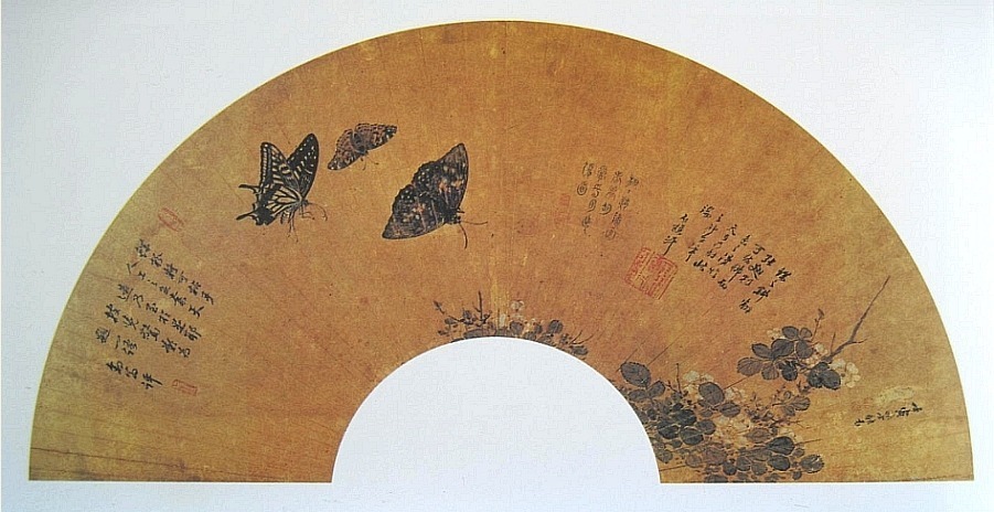 부채의 둥근 화면 오른편에 비스듬히 찔레꽃을 배치하고,