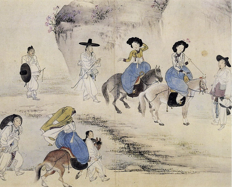 한 친구는 시간에 늦었던지 갓 벗어 짊어지고 옷자락에 바람 일구며 동자구종(童子驅從)을 급히 몰아 달려오는데, 말 탄 기생의 초록 장옷도 깃발처럼 뒤로 나부낀다. 암벽에는 진달래인 듯 분홍꽃을 가득 피운 나무들이 군데군데 있고 구름 같은 기생의 트레머리에 그 꽃가지가 꽂혔으며 물빛으로 갈라놓은 삼거리 주변에는 청태점(靑苔點)이 분분(紛紛)하여 답청(踏靑)이 실감된다.