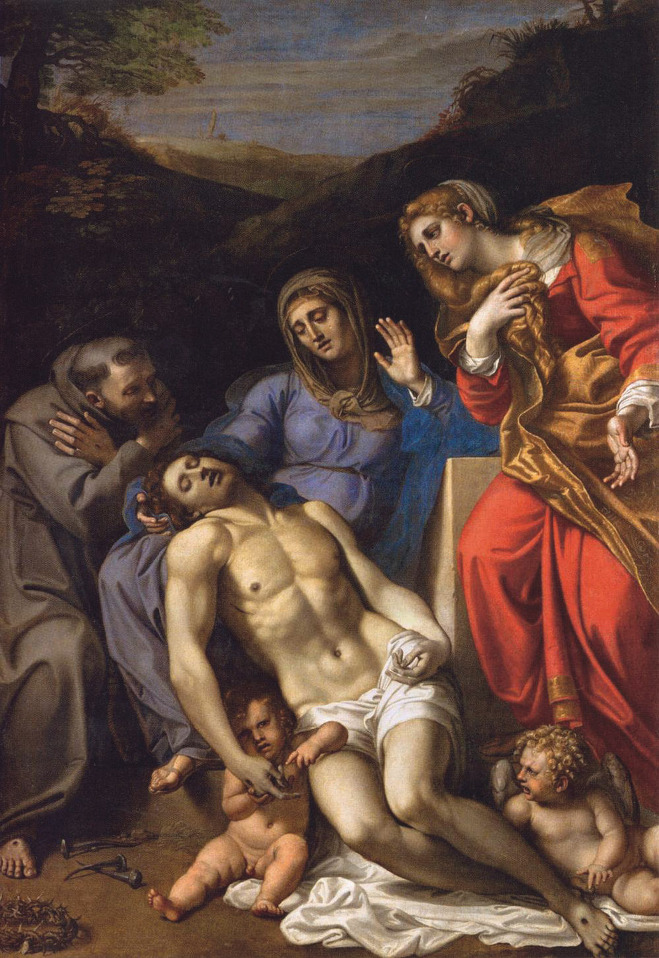 죽은 예수를 안고 비통해하는 성모의 ‘피에타’ 상에 막달라 마리아와 성 프란체스코가 함께하는 장면을 담고 있다. 막달라 마리아는 예수가 부활했을 때 가장 먼저 그 모습을 목격한 여인으로, 예수가 승천한 뒤 광야를 떠돌며 선교에 몰두했다고 한다. 그간의 허영과 허식을 버리기 위해 그녀는 머리카락이 자라는 대로 내버려 두고, 그것으로 옷을 대신했다는 전설에 따라 주로 긴 머리칼이 그녀를 상징한다. 막달라 마리아는 한때 매음굴에서 일한 전적이 있으나 예수를 직접 찾아와 그의 발에 향유를 뿌리고 그 죄를 회개했다고 해서 향유병을 함께 그려 넣기도 한다.