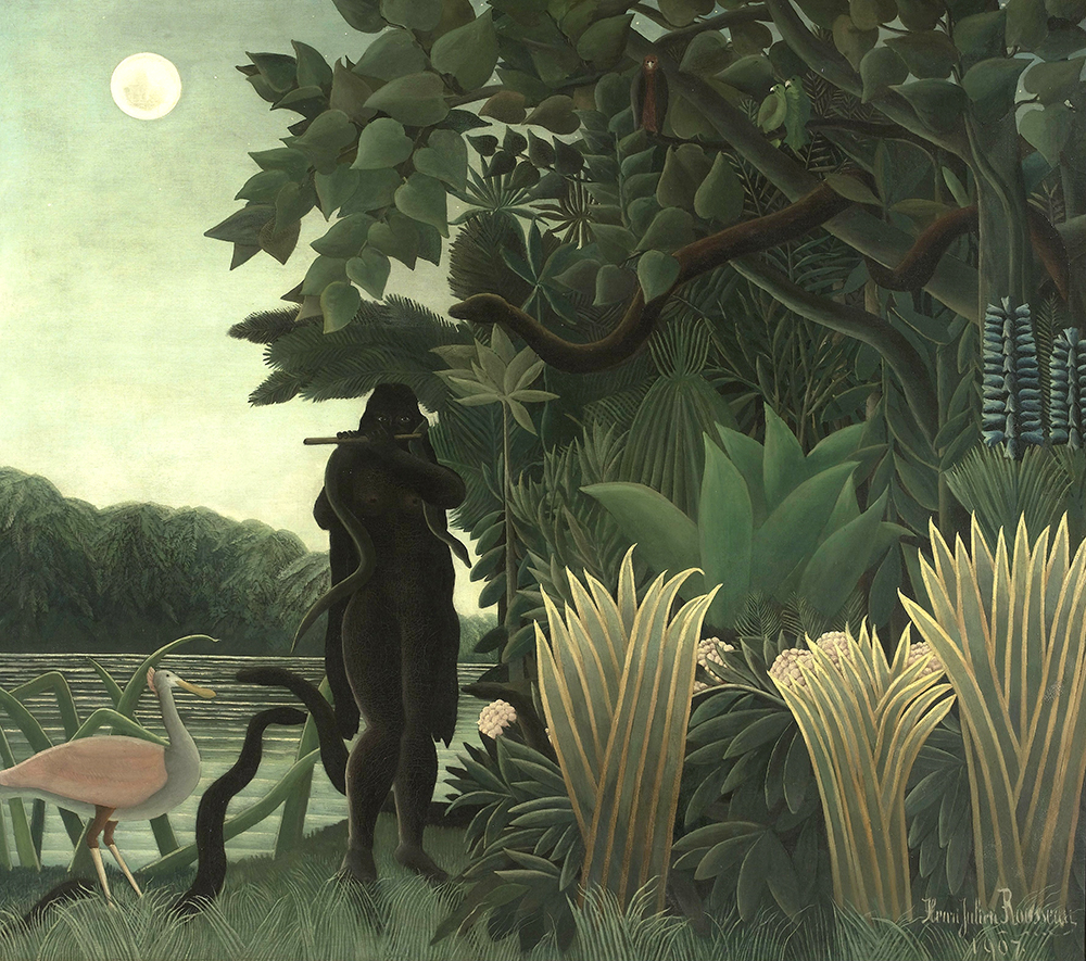 눈만 빛나는 흑인 여인이 침묵이 흐르는 듯한 물가의 정글에서 피리를 불고 있고, 근처의 나무에서 바닥에서 뱀들이 그를 향해 몰려들고 있는 모습을 그린 것이다. 이 여인은 뱀을 불러들이기 위해 피리를 불고 있지만, 그림에서는 침묵이 흐르고 있다. 이 여인을 검은 이브로 상정한 평론가들은 그녀의 피리소리에 뱀이 몰려들고 있는 무시무시한 상황임에도 그림은 에로틱한 분위기가 흐른다고 생각했다. 이 그림을 소장하고 있는 오르세 미술관의 해설에는 이 그림의 소재를 비롯하여, 수직으로 이루어진 비정형 구도, 밝으면서도 진한 컬러, 뒤에서 비추이는 조명 등 이 그림의 모든 것이 새롭다고 평가했다. 이 그림은 초현실주의의 전형적인 그림으로, 후에 루소가 달리나 마그리트 같은 화가들에게 영감을 주었다는 것이 하나도 놀랍지 않다.