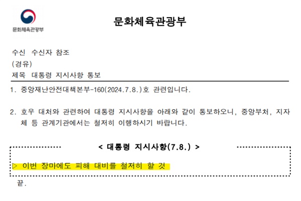 "간략한 대통령 지시사항이 그간 없었던 것은 아니다. 하지만 재난, 안전과 관련해서 이렇게까지 짧은 지시사항은 처음 본다. 국민들은 반지하 침수, 오송 지하차도 참사 등 어려움을 겪어왔다. 그런 상황에서 (이번처럼) 한 줄로 나가는 것은 당연히 곤란하다."