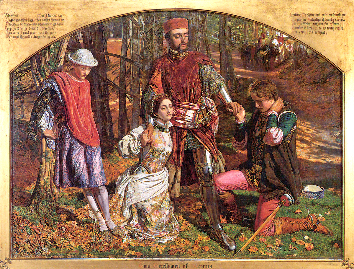 프로테우스로부터 실비아를 구출하는 발렌타인은 영국 화가 윌리엄 홀먼 헌트가 그린 1851년 유화입니다. 윌리엄 셰익스피어 의 베로나의 두 신사 의 한 장면을 묘사한 것입니다. 프레임의 왼쪽 상단과 오른쪽 부분에는 극의 5막 4장에서 발췌한 내용이 포함되어 있습니다.왼쪽부터 페이지로 변장한 줄리아, 실비아, 발렌타인, 줄리아를 사랑하는 프로테우스. 배경에는 실비아의 아버지 밀랭 공작과 추종자들이 있습니다.