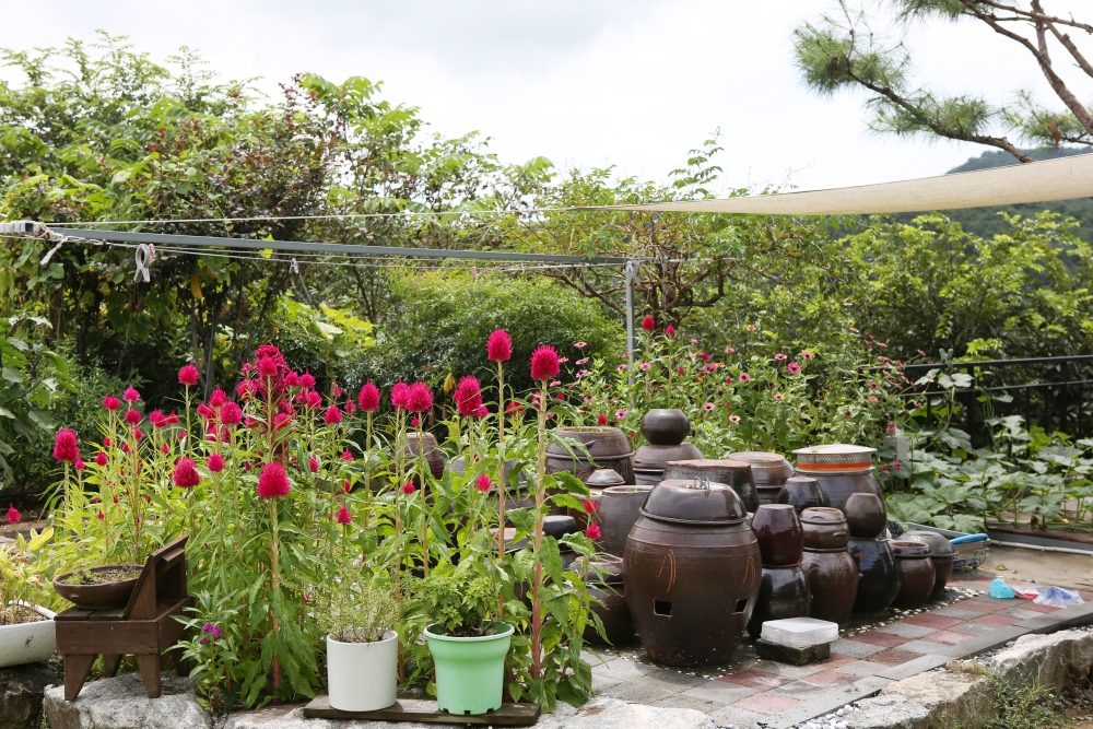 장독대 가에서 타오른 듯 만발했습니다.