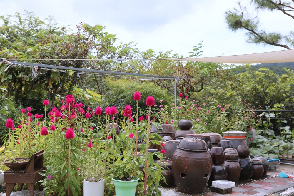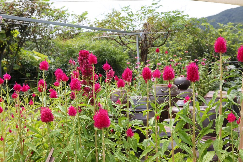 장독대 가에서 타오른 듯 만발했습니다.
