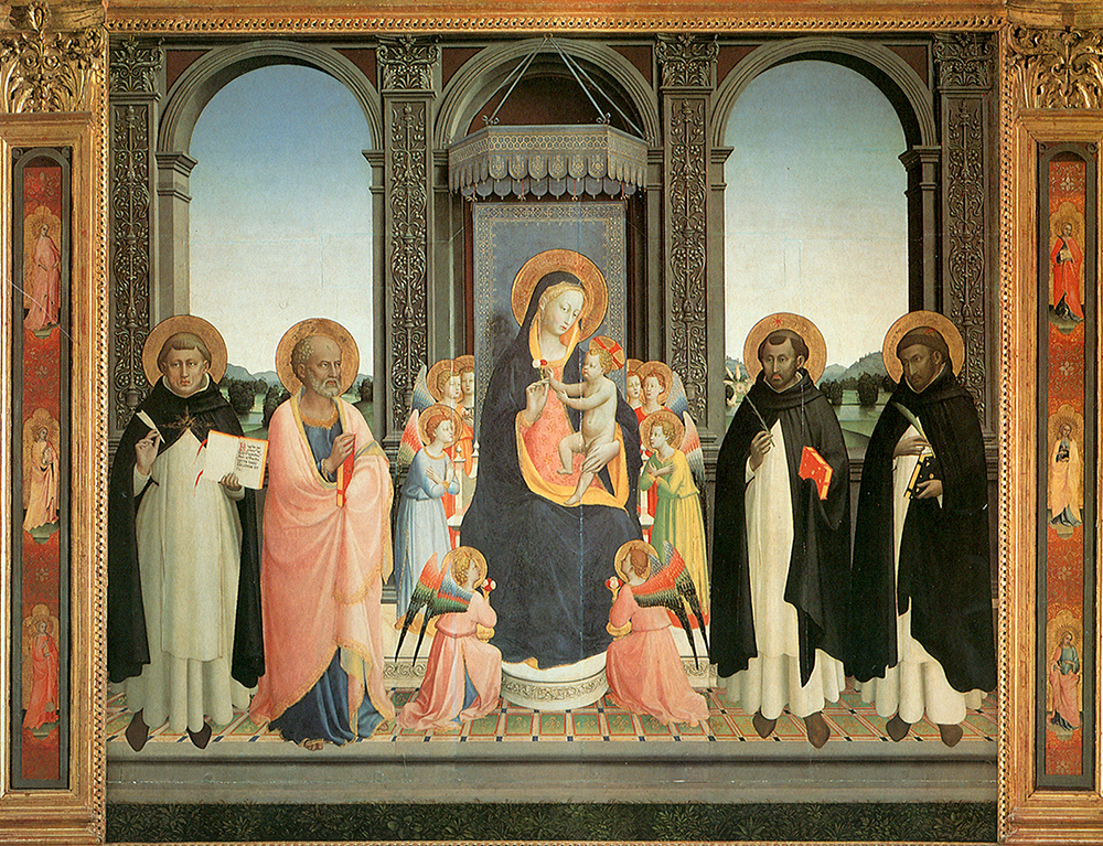 동방 박사들의 경배바티칸에서 자선을 배포하는 성 로렌스 (1447)산 마르코 제단화심판의 날 , 제단의 상단 패널. 의뢰받은 작품에서 요구되는 정밀함, 디테일, 컬러를 보여줍니다.성 코스마스와 다미안 , 성 마르코 와 성 요한 , 성 로렌스 와 세 명의 도미니크 수도회, 성 도미니코 , 성 토마스 아퀴나스 , 성 베드로 순교자 와 함께 왕좌에 앉은 마돈나성도들의 삶의 활동을 보여줌, 1420성자들과 함께 있는 성모와 아기수태 고지 , c. 1440년~1445년십자가에서의 강림 , 산 마르코 박물관축복의 구속자 (1423)