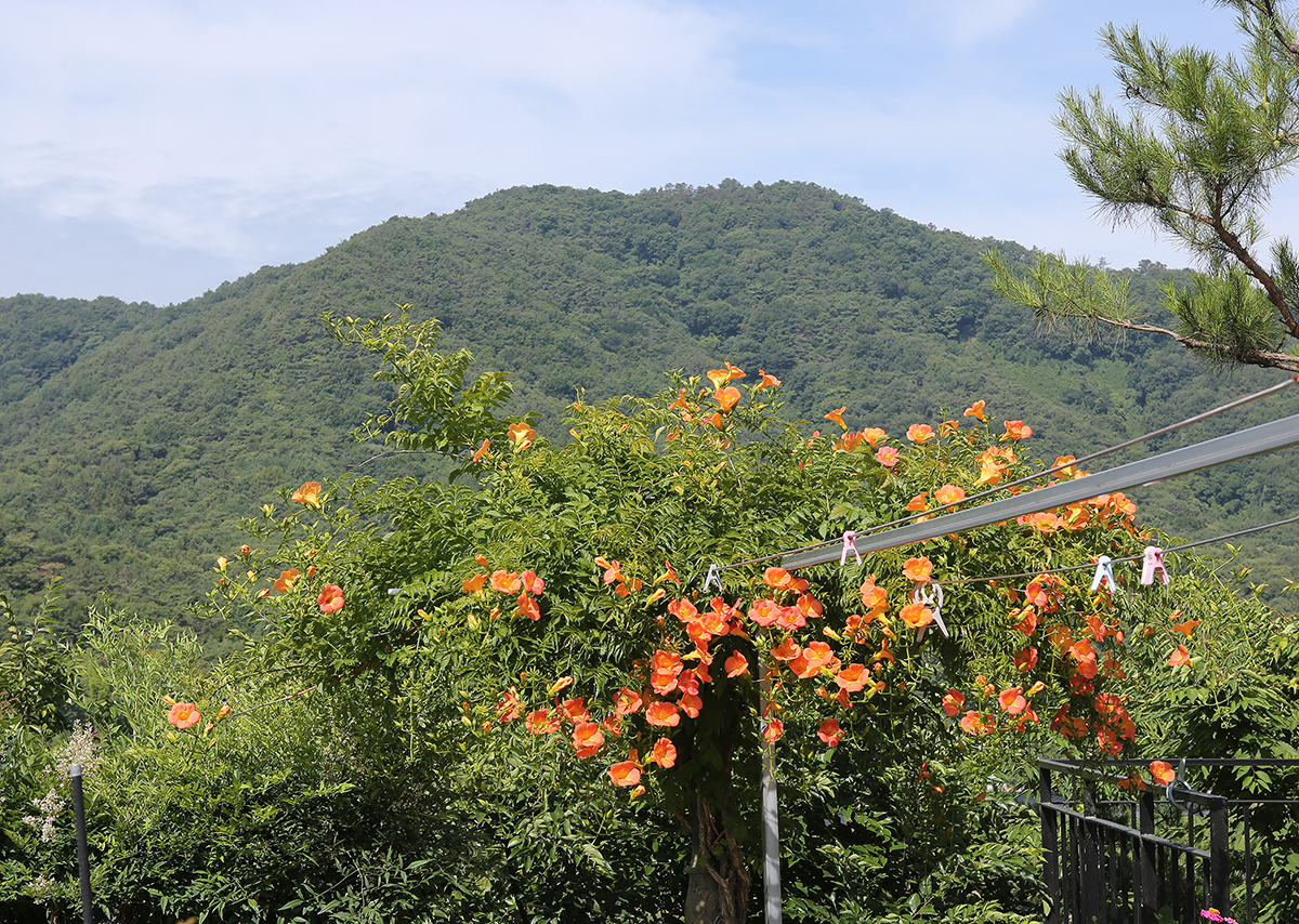 그러나 푸르름 속에서 화사한 봄꽃의 색깔이 그리워 질 때면 정원엔 붉은 자귀나무가 피기시작하고 본격적인 여름의 시작을 알리는 능소화가 우리 두 식구의 눈길을 끌고 있습니다