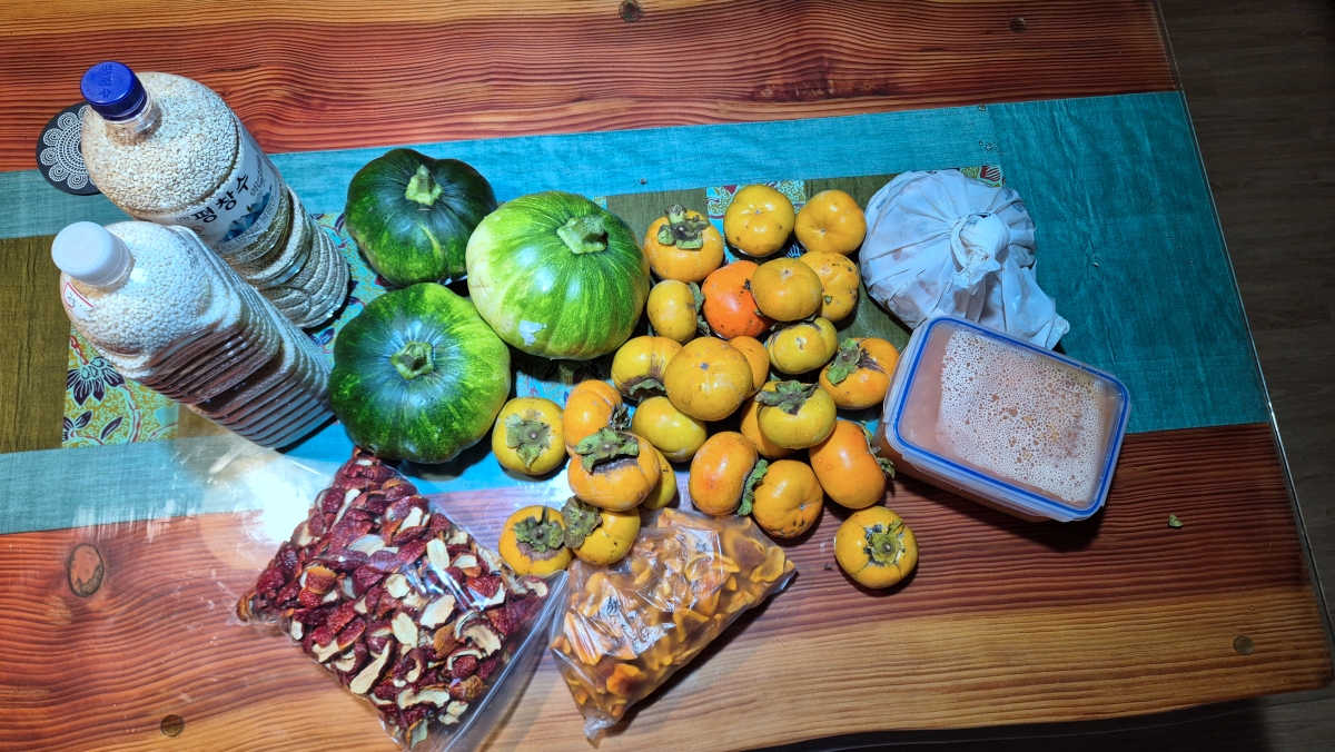 찹쌀, 보리쌀, 감, 말린 대추, 말린 감, 호박죽