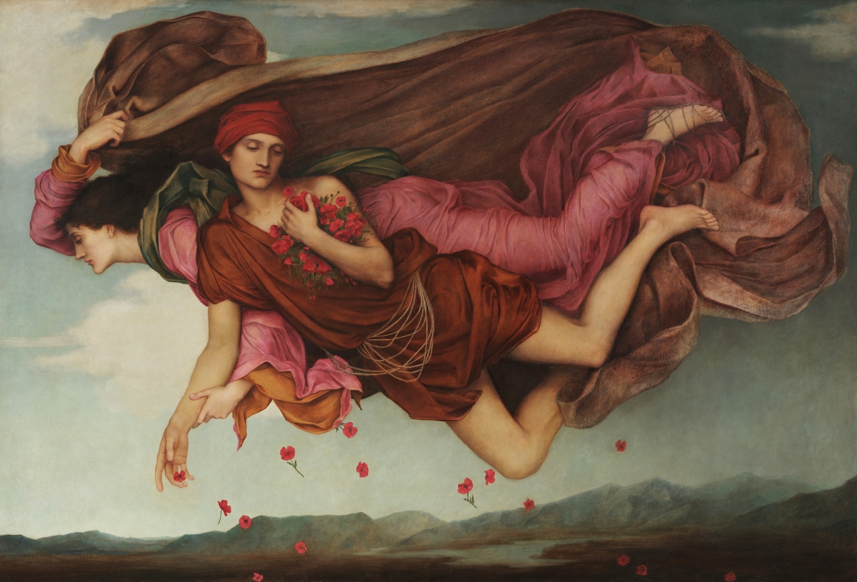 밤이 저녁 하늘을 떠다니며, 그의 붉은 옷은 일몰을 연상시키고, 그의 펄럭이는 망토는 그의 뒤에서 하늘을 어둡게 합니다. 그는 허리띠에서 꺼낸 꽃 한 움큼에서 양귀비를 살며시 땅에 뿌립니다. (빅토리아인들은 아편 양귀비의 팅크로 만든 라우다눔을 수면제로 사용했습니다.) 두 인물 모두 눈을 감고 마치 이미 반쯤 잠든 것처럼 편안해 보입니다. 이 그림의 구성은 보티첼리의 비너스의 탄생에서 영감을 받았는데, 제피로스와 클로리스가 사지가 얽힌 이중적 존재로 날아갑니다. 붉은 제피로(그리스어로 "서풍")는 힘차게 숨을 내쉬고 있고, 아름다운 클로리스는 비너스를 해안으로 날려보내는 따뜻한 숨결을 부드럽게 한숨쉬고 있습니다. 그들 주변에는 장미가 떨어지고 있습니다. 각각 황금빛 심장을 가진 장미는 전설에 따르면 비너스가 태어났을 때 생겨났다고 합니다.