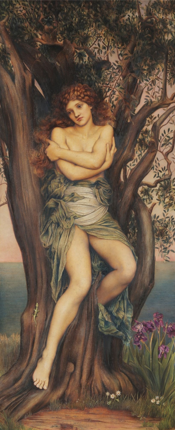 그리스 신화에서 드라이어드는 신화적인 나무 요정이며 참나무의 수호자입니다. 에블린은 나무 자체에 결속된 요정의 일종인 하마드리아데를 묘사한 것으로 보입니다. 이 그림에서 우리는 나무에서 나오는 작은 요정을 볼 수 있으며, 그녀의 발은 여전히 나무의 튼튼한 줄기 안에 숨겨져 있습니다. 전설에 따르면 나무가 죽으면 드라이어드도 죽고, 이런 이유로 신들은 나무에 해를 끼치는 모든 필멸자를 처벌한다고 합니다. 보라색 아이리스는 드라이어드의 발 아래에 있는데, 이는 그리스의 하급 여신 이리스를 상징합니다. 이리스는 신, 특히 제우스와 헤라의 사자입니다. 그녀는 또한 무지개의 의인화이며, 바다와 하늘의 여신으로서 구름에 물을 제공하여 세상에 비를 내려 식물과 나무에 영양을 공급합니다. 드라이어드의 모델은 제인 헤일스였는데, 그녀는 처음에 에블린의 가족에서 여동생 빌헬미나(후에 스털링 부인)의 보육원으로 고용되었습니다. 더 이상 보육원 하인이 필요하지 않게 되자 에블린은 그녀를 하인 겸 모델로 고용했다.