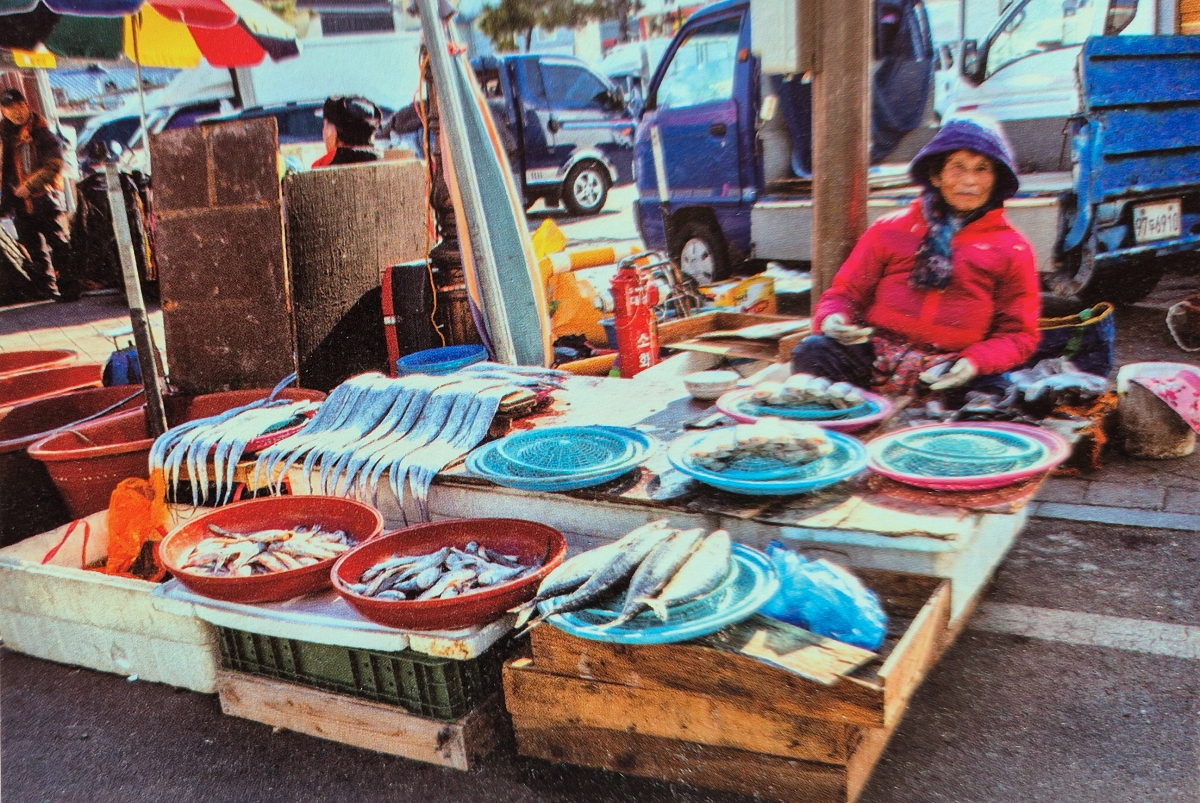 겨울장터를 덥히는 말씀을 내어놓는 강진장 조야임 (83) 어매.