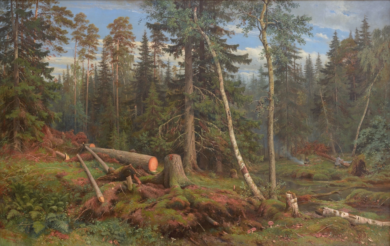 소나무 숲. 1872년 Viatka 지방의 돛대 목재 숲