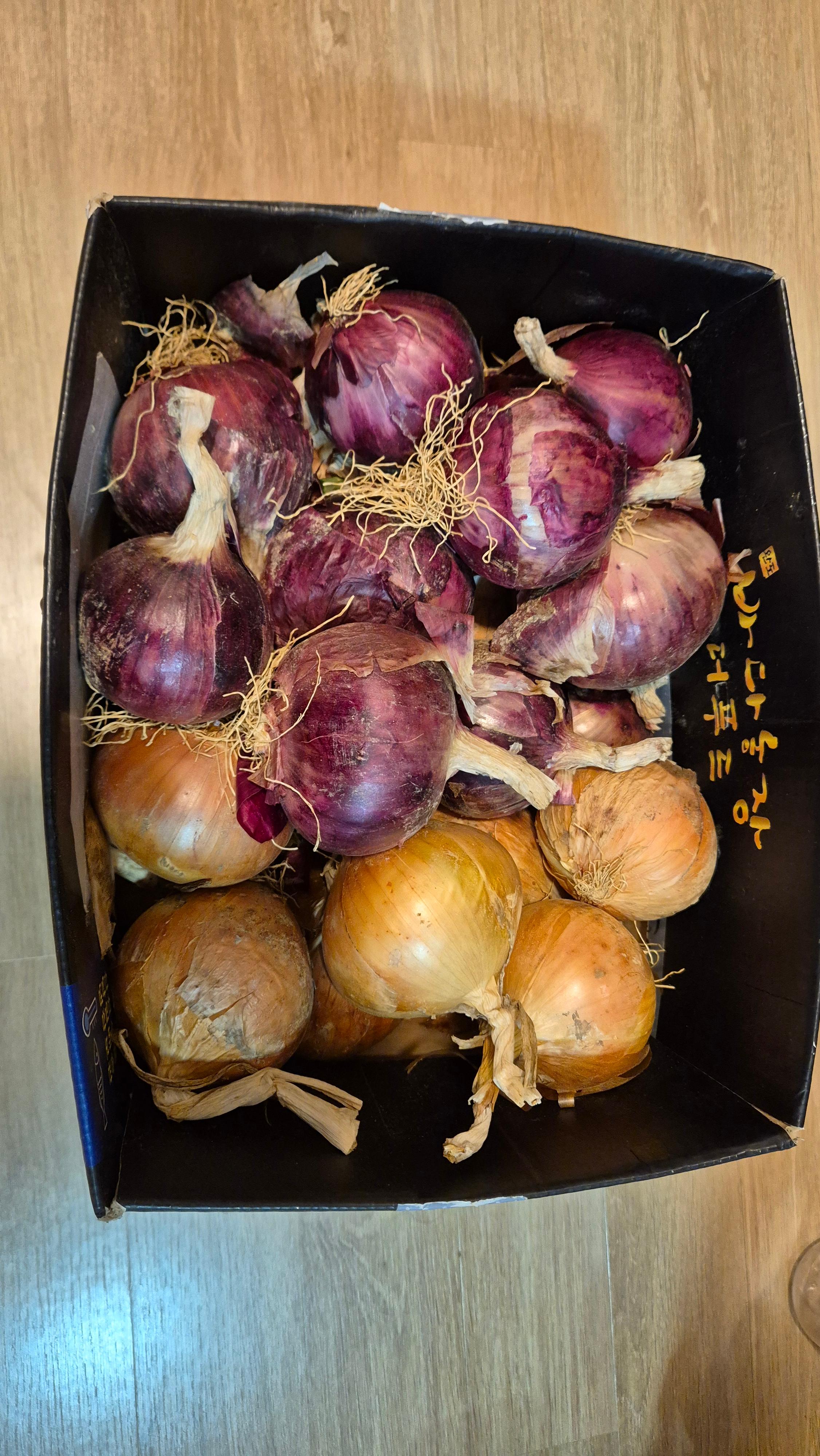 손수 재배한 양파, 마늘, 마늘을 꿀에 절인것과 자두등등