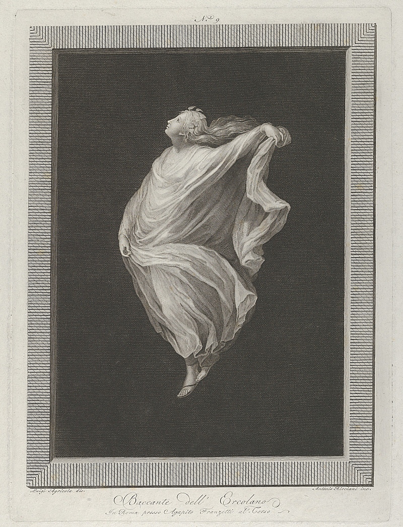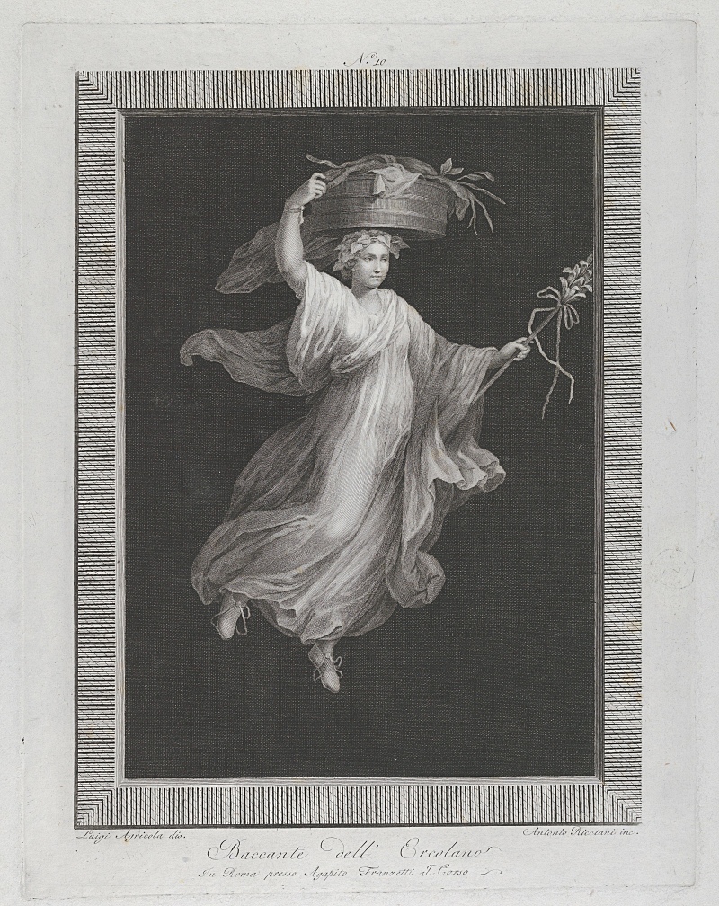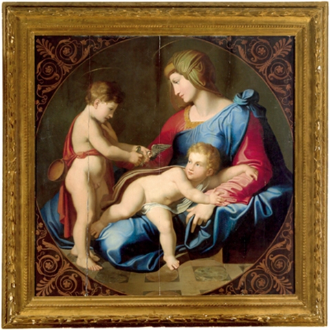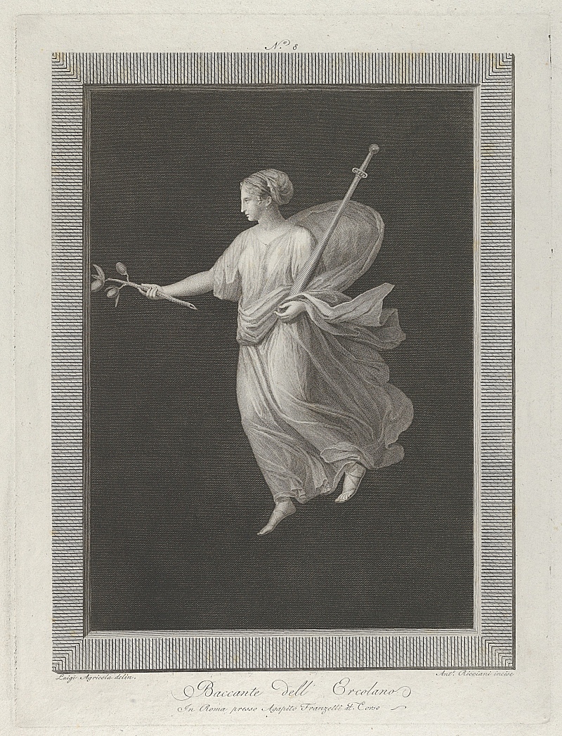 성모 마리아와 어린 세례자 요한과 함께 있는 아기 예수뒤에서 본 반쯤 벗은 바쿠스 여신이 오른쪽을 향하고 왼손에는 타원형 접시를, 오른손에는 천을 들고 있으며머리에 큰 바구니를 이고 왼손에 지팡이를 든 바쿠스 여신왼쪽을 향해 뻗은 왼팔로 그녀의 커튼을 잡고 있는 옆모습의 바쿠스 여신왼팔에 칼을, 오른손에 과일이 담긴 나뭇가지를 든 바쿠스 여신