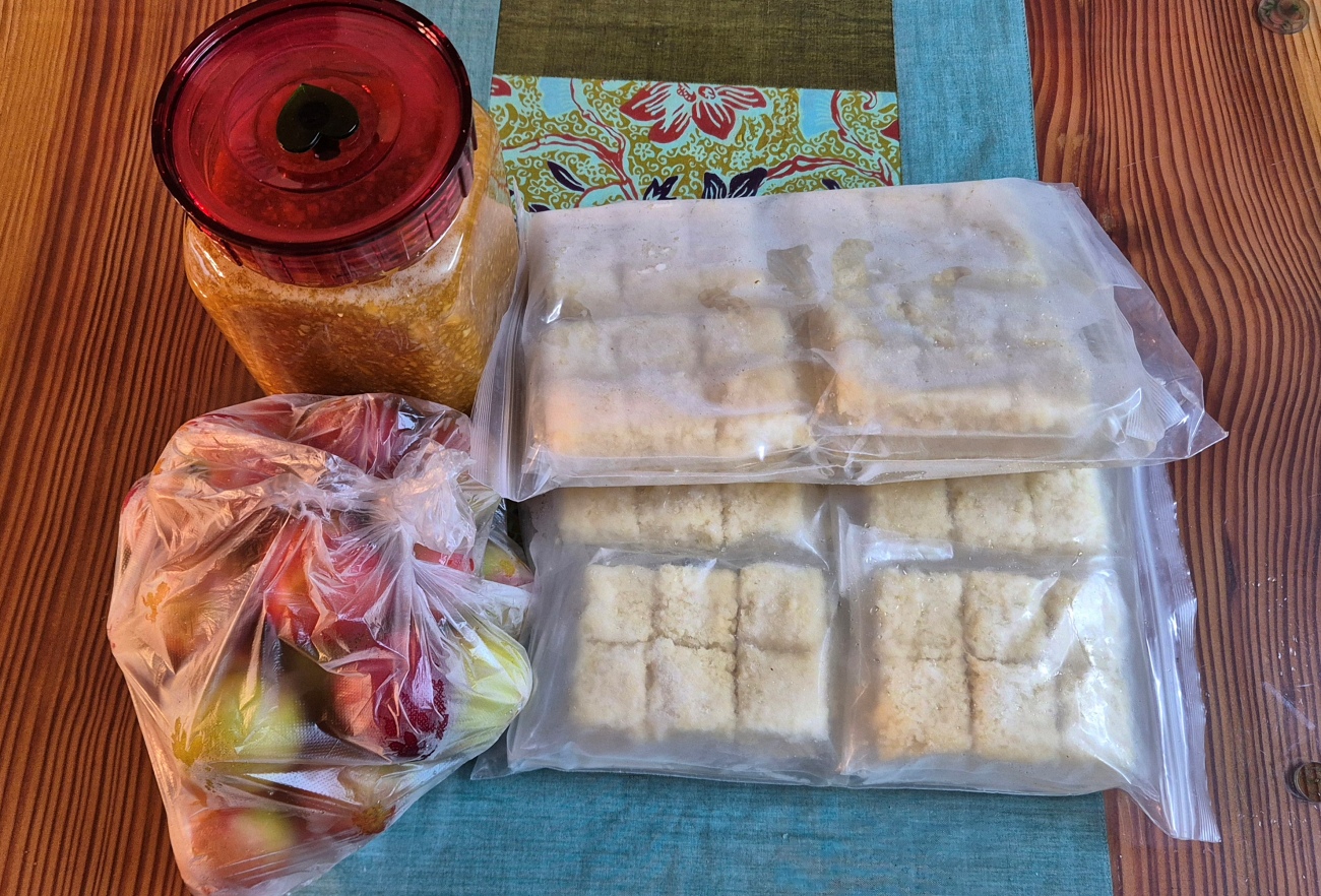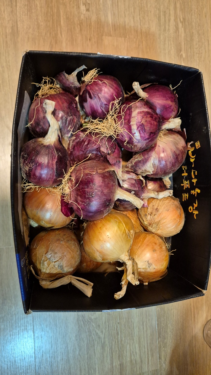 손수 재배한 양파, 조각 마늘, 그리고 마늘을 꿀에 절인 것, 자두등등