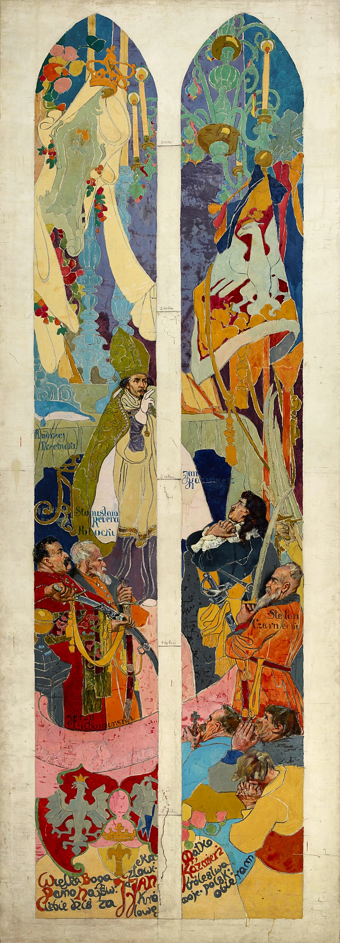 스테인드글라스의 유명한 작품은 프란치스코 교회와 크라쿠프 의학회관에 설치된 기념비적인 스테인드글라스와 다색 디자인에서 찾아볼 수 있습니다.